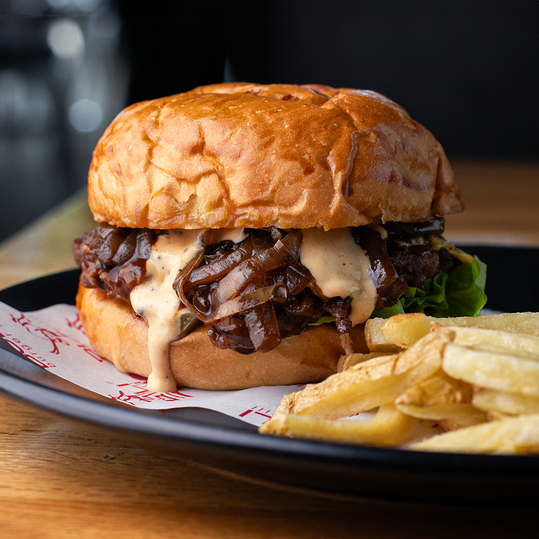 Queso americano, cebolla caramelizada y salsa secreta, lechuga, tomate, cebolla.