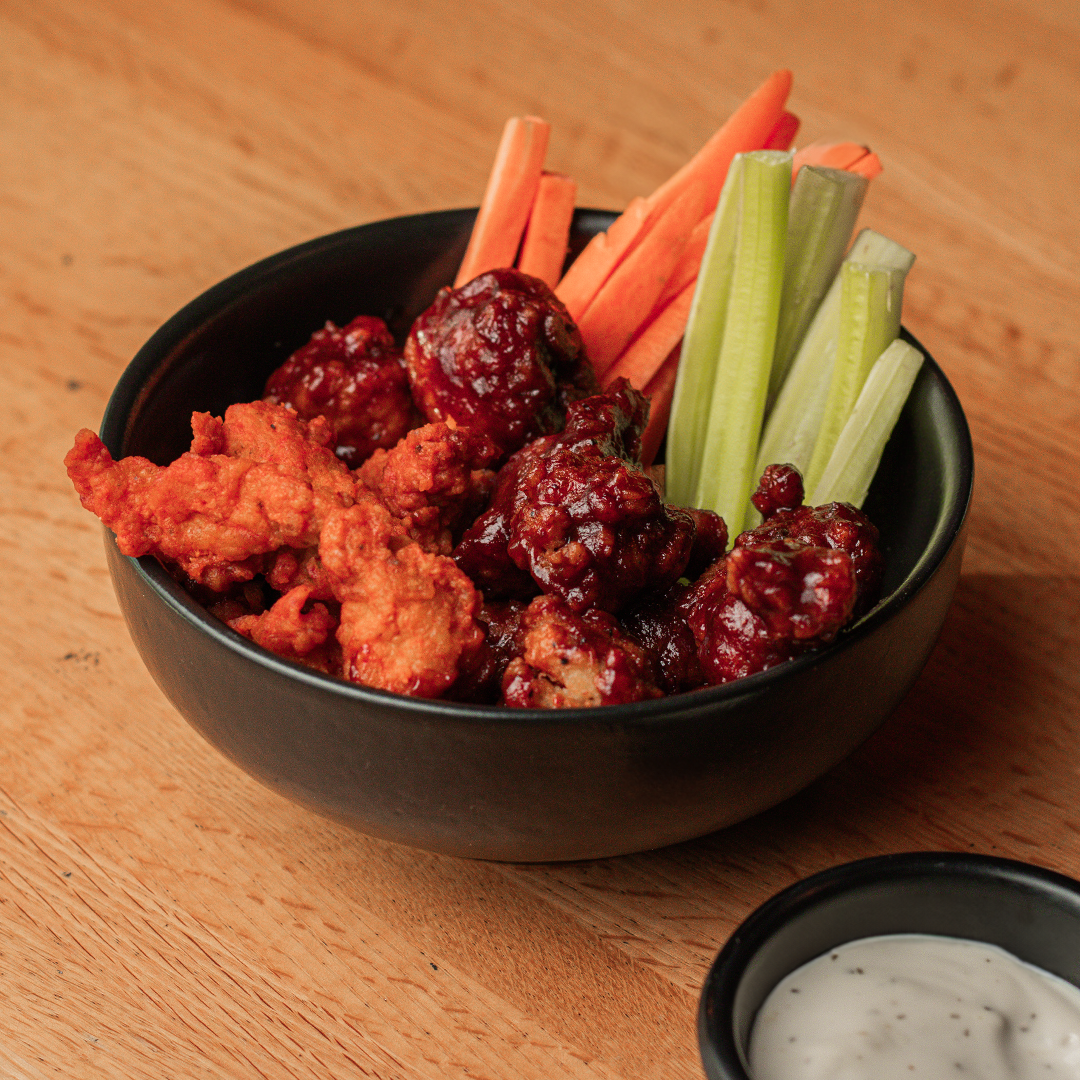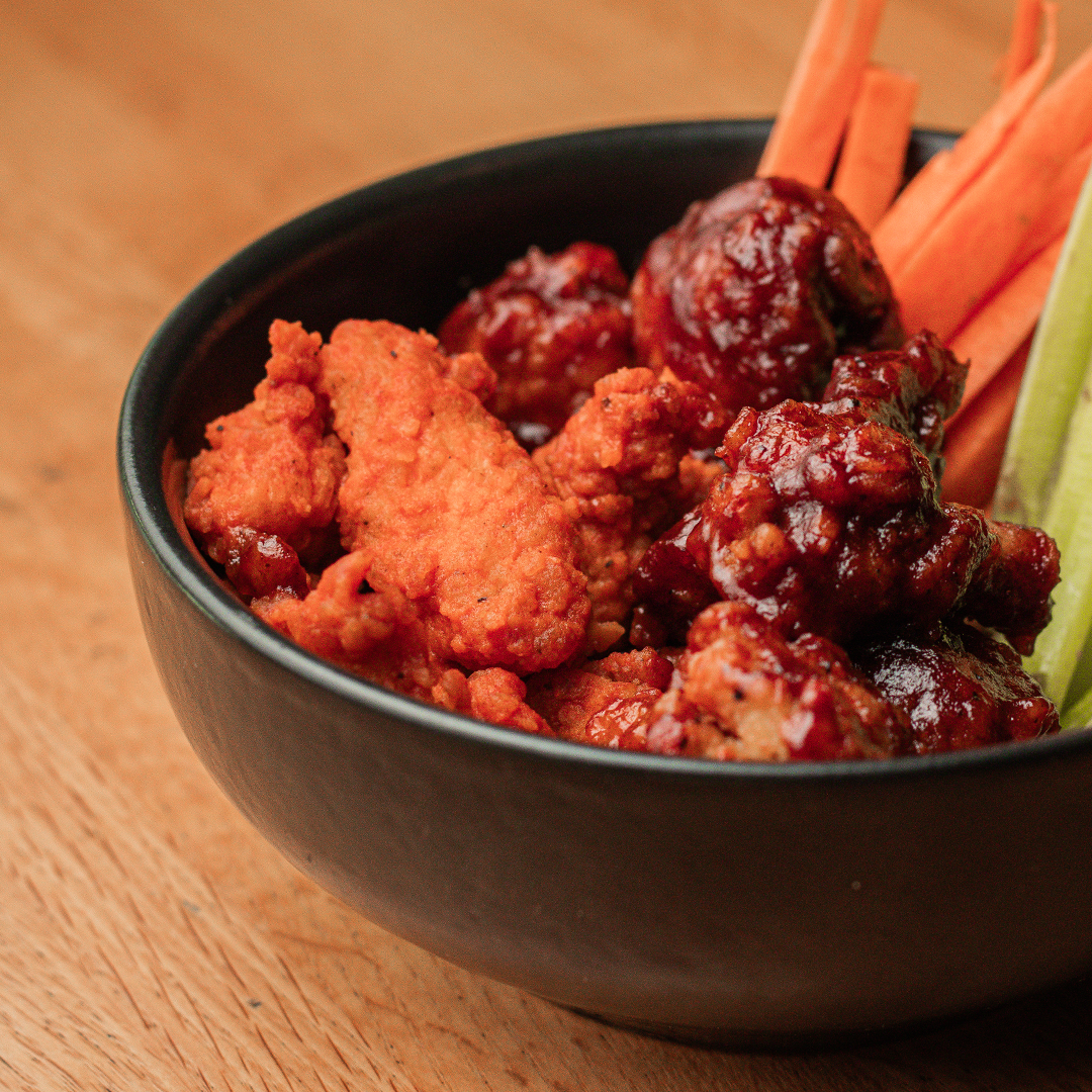 Pechuga de pollo en tiras empanizadas y bañadas con salsa Buffalo o BBQ.