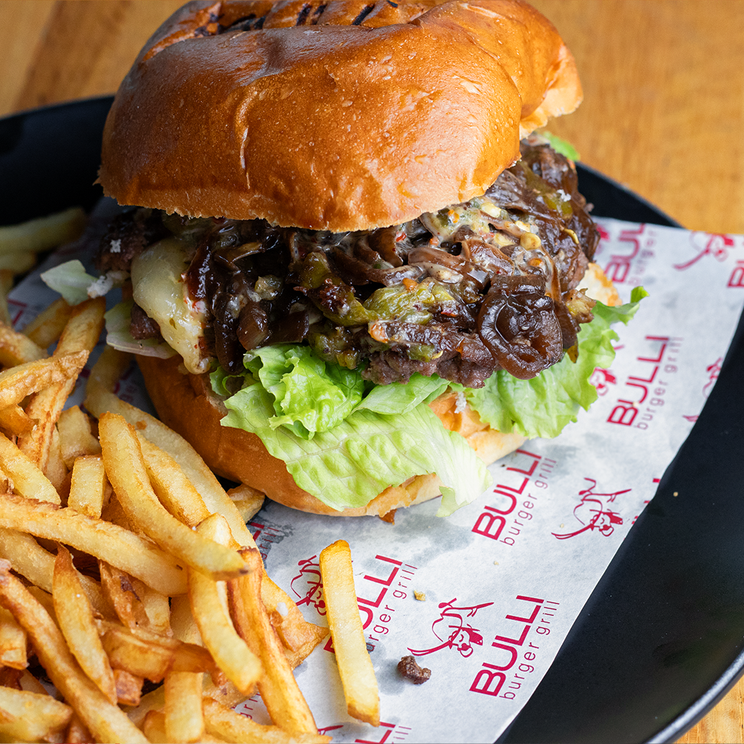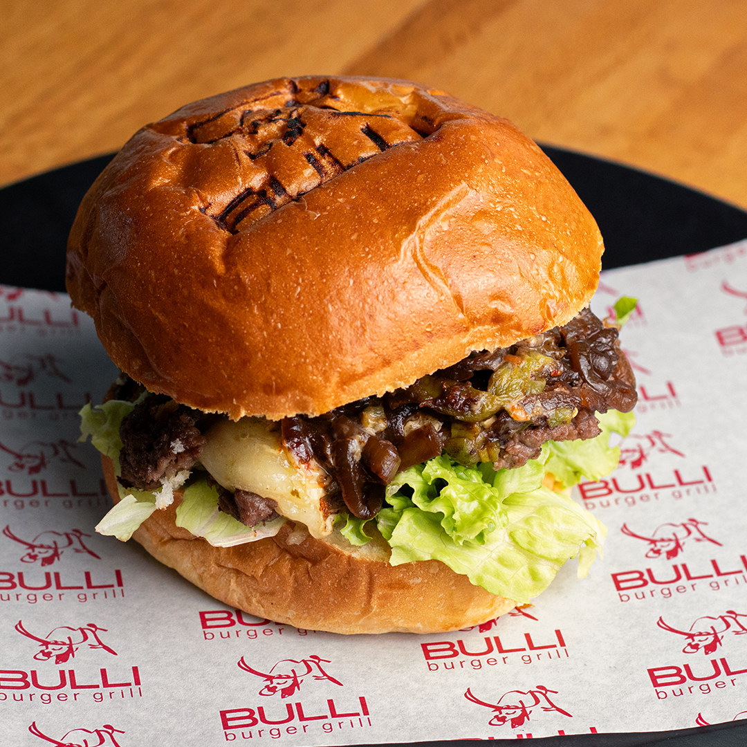 Queso pepperjack, chile serrano tatemado, cebollas Bulli, rajas de chile verde, mayonesa chiltepín, lechuga, tomate, cebolla.