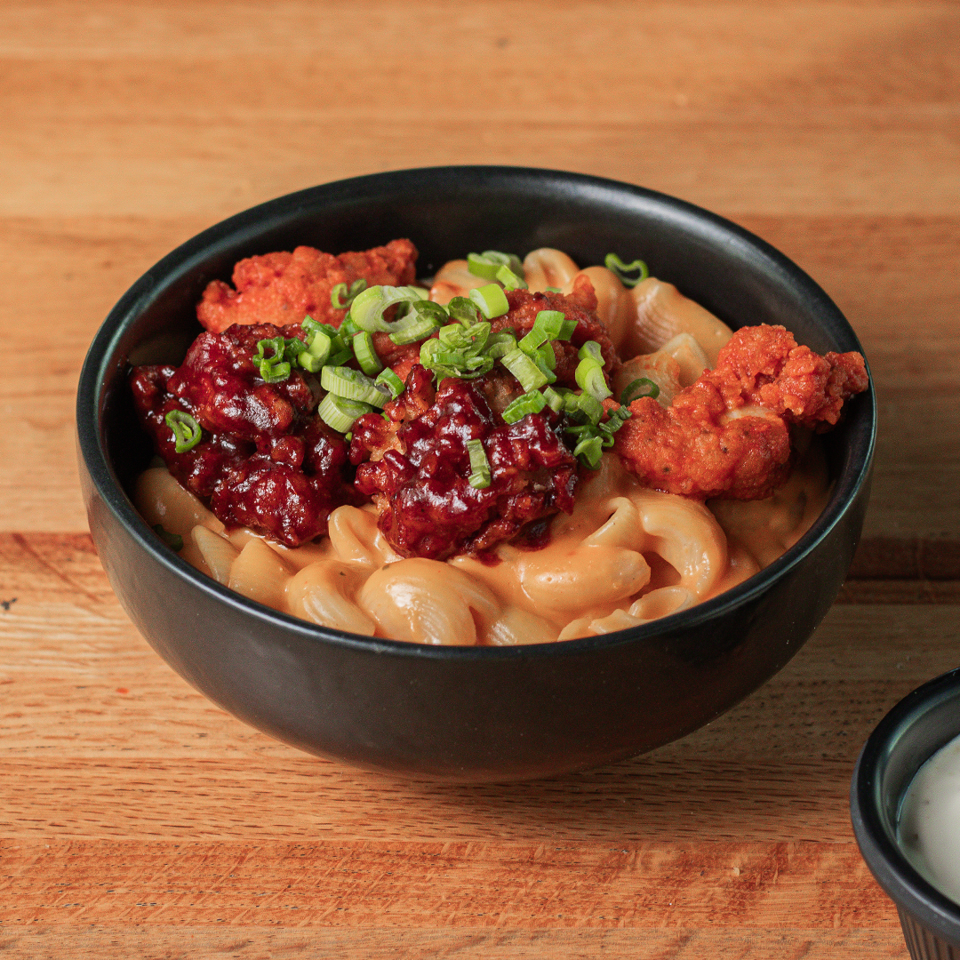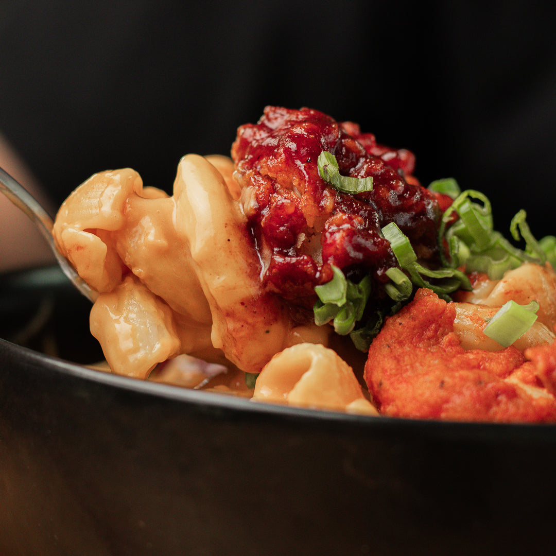 Macarrones en queso cheddar, queso chihuahua y cebollín.