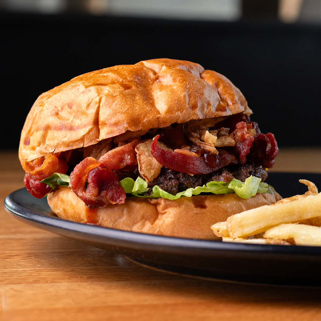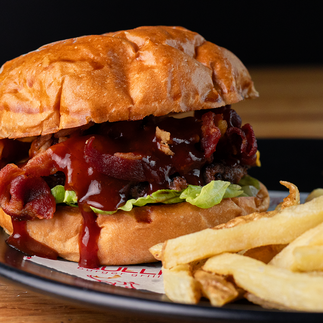 Queso americano, cebolla crujiente, tocino, BBQ, lechuga, tomate, cebolla.